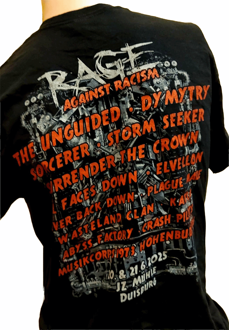 Das offizielle Rage Against Racism Festival Shirt vereint die ikonische Mühle im kraftvollen Metal-Style mit markanten Steampunk-Elementen. Ein hochwertiges Band- und Festival-Shirt für alle, die Haltung zeigen und Qualität tragen wollen.